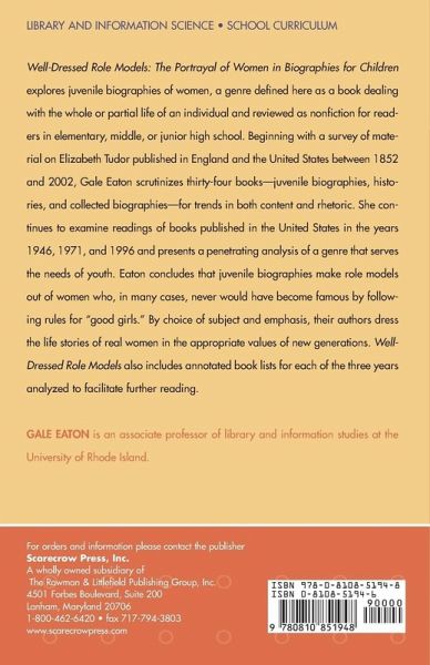 This study provides a qualitative exploration of juvenile biographies of women, a genre defined here as a book dealing with the whole or partial life of an individual and reviewed as nonfiction for readers in elementary, middle, or junior high school. Beginning with a survey of juvenile material on Elizabeth Tudor published in England and the United States between 1852 and 2002, author Gale Eaton scrutinizes thirty-four books-juvenile biographies, histories, and collected biographies-for trends in both content and rhetoric. Well-Dressed Role Models: The Portrayal of Women in Biographies for Children then goes on to look at close readings of books published in the United States in the years 1946, 1971, and 1996 and presents a penetrating analysis of a genre that serves the needs of youth. The findings of this study include the fact that juvenile biographies make role models out of women who, in many cases, never would have become famous by following all the rules for good girls. By choice of subject and emphasis, their authors dress the life stories of real women in the appropriate values of new generations. Three appendixes providing annotated book lists for each of the three years analyzed conclude this study.