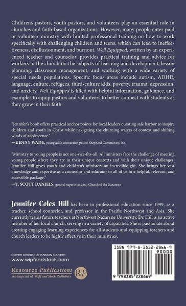 Children's pastors, youth pastors, and volunteers play an essential role in churches and faith-based organizations. However, many people enter paid or volunteer ministry with limited professional training on how to work specifically with challenging children and teens, which can lead to ineffectiveness, disillusionment, and burnout. Well Equipped, written by an experienced teacher and counselor, provides practical training and advice for workers in the church on the subjects of learning and development, lesson planning, classroom management, and working with a wide variety of special needs populations. Specific focus areas include autism, ADHD, language, culture, refugees, third-culture kids, poverty, trauma, depression, and anxiety. Well Equipped is filled with helpful information, guidance, and examples to equip pastors and volunteers to better connect with students as they grow in their faith.