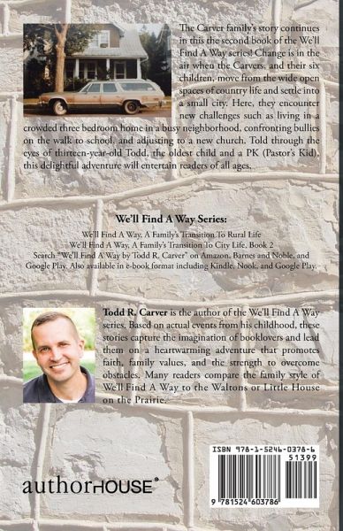 The Carver family's story continues in this the second book of the We'll Find a Way series! Change is in the air when the Carvers and their six children move from the wide open spaces of country life and settle into a small city. Here, they encounter new challenges, such as living in a crowded three-bedroom home in a busy neighborhood, confronting bullies on the walk to school, and adjusting to a new church. Told through the eyes of thirteen-year-old Todd, the oldest child and a PK (pastor's kid), this delightful adventure will entertain readers of all ages. Todd R. Carver is the author of the We'll Find a Way series. Based on actual events from his childhood, these stories capture the imagination of booklovers and lead them on a heartwarming adventure that promotes faith, family values, and the strength to overcome obstacles. Many readers compare the family style of We'll Find a Way to the Waltons or Little House on the Prairie.