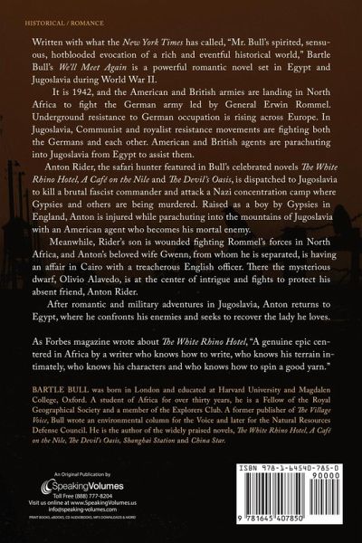 Written with what the New York Times has called, "Mr. Bull's spirited, sensuous, hotblooded evocation of a rich and eventful historical world," Bartle Bull's We'll Meet Again is a powerful romantic novel set in Egypt and Jugoslavia during World War II. It is 1942, and the American and British armies are landing in North Africa to fight the German army led by General Erwin Rommel. Underground resistance to German occupation is rising across Europe. In Jugoslavia, Communist and royalist resistance movements are fighting both the Germans and each other. American and British agents are parachuting into Jugoslavia from Egypt to assist them. Anton Rider, the safari hunter featured in Bull's celebrated novels The White Rhino Hotel, A Café on the Nile and The Devil's Oasis, is dispatched to Jugoslavia to kill a brutal fascist commander and attack a Nazi concentration camp where Gypsies and others are being murdered. Raised as a boy by Gypsies in England, Anton is injured while parachuting into the mountains of Jugoslavia with an American agent who becomes his mortal enemy. Meanwhile, Rider's son is wounded fighting Rommel's forces in North Africa, and Anton's beloved wife Gwenn, from whom he is separated, is having an affair in Cairo with a treacherous English officer. There the mysterious dwarf, Olivio Alavedo, is at the center of intrigue and fights to protect his absent friend, Anton Rider. After romantic and military adventures in Jugoslavia, Anton returns to Egypt, where he confronts his enemies and seeks to recover the lady he loves. As Forbes magazine wrote about The White Rhino Hotel, "A genuine epic centered in Africa by a writer who knows how to write, who knows his terrain intimately, who knows his characters and who knows how to spin a good yarn."