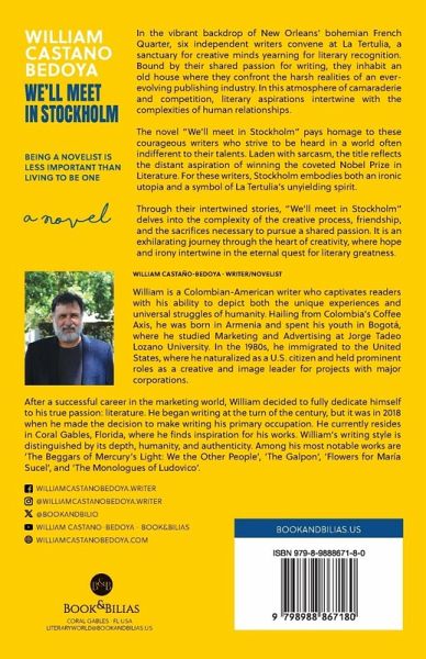 "Being a novelist is less important than living to be one."In the vibrant backdrop of New Orleans' bohemian French Quarter, six independent writers convene at La Tertulia, a sanctuary for creative minds yearning for literary recognition. Bound by their shared passion for writing, they inhabit an old house where they confront the harsh realities of an ever-evolving publishing industry. In this atmosphere of camaraderie and competition, literary aspirations intertwine with the complexities of human relationships. The novel "We'll Meet in Stockholm" pays homage to these courageous writers who strive to be heard in a world often indifferent to their talents. Laden with sarcasm, the title reflects the distant aspiration of winning the coveted Nobel Prize in Literature. For these writers, Stockholm embodies both an ironic utopia and a symbol of La Tertulia's unyielding spirit. Through their intertwined stories, "We'll Meet in Stockholm" delves into the complexity of the creative process, friendship, and the sacrifices necessary to pursue a shared passion. It is an exhilarating journey through the heart of creativity, where hope and irony intertwine in the eternal quest for literary greatness.