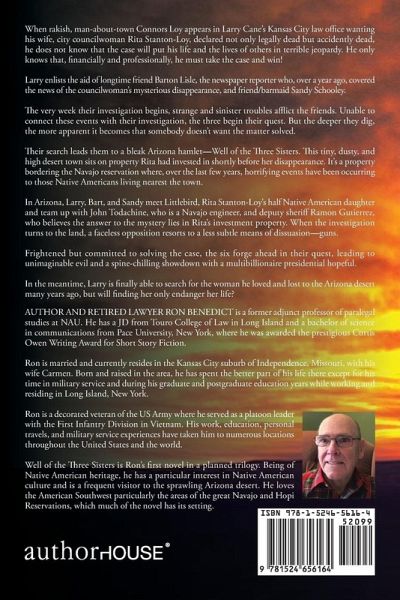 When rakish, man-about-town Connors Loy appears in Larry Cane’s Kansas City law office wanting his wife, city councilwoman Rita Stanton-Loy, declared not only legally dead but accidently dead, he does not know that the case will put his life and the lives of others in terrible jeopardy. He only knows that, financially and professionally, he must take the case and win! Larry enlists the aid of longtime friend Barton Lisle, the newspaper reporter who, over a year ago, covered the news of the councilwoman’s mysterious disappearance, and friend/barmaid Sandy Schooley. The very week their investigation begins, strange and sinister troubles afflict the friends. Unable to connect these events with their investigation, the three begin their quest. But the deeper they dig, the more apparent it becomes that somebody doesn’t want the matter solved. Their search leads them to a bleak Arizona hamlet—Well of the Three Sisters. This tiny, dusty, and high desert town sits on property Rita had invested in shortly before her disappearance. It’s a property bordering the Navajo reservation where, over the last few years, horrifying events have been occurring to those Native Americans living nearest the town. In Arizona, Larry, Bart, and Sandy meet Littlebird, Rita Stanton-Loy’s half Native American daughter and team up with John Todachine, who is a Navajo engineer, and deputy sheriff Ramon Gutierrez, who believes the answer to the mystery lies in Rita’s investment property. When the investigation turns to the land, a faceless opposition resorts to a less subtle means of dissuasion—guns. Frightened but committed to solving the case, the six forge ahead in their quest, leading to unimaginable evil and a spine-chilling showdown with a multibillionaire presidential hopeful. In the meantime, Larry is finally able to search for the woman he loved and lost to the Arizona desert many years ago, but will finding her only endanger her life?