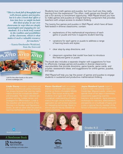 Students love math games and puzzles, but how much are they really learning from the experience? Too often, math games are thought of as just a fun activity or enrichment opportunity. Well Played, Grades K-2: Building Mathematical Thinking Through Number Games and Puzzles, shows you how to make games and puzzles an integral learning component that provides teachers with unique access to student thinking. The twenty-five games and puzzles in Well Played, Grades K-2 , which have all been field-tested in diverse classrooms, contain: Explanations of the mathematical importance of each game or puzzle and how it supports student learning Variations for each game or puzzle to address a range of learning levels and styles Classroom vignettes that model how best to introduce the featured game or puzzle The book also includes a separate chapter with suggestions for how to effectively manage games and puzzles in diverse classrooms;game boards, game cards, and puzzles; assessment ideas; and suggestions for online games, puzzles, and apps. Well Played, Grades K-2 will help you tap the power of games and puzzles to engage students in sustained and productive mathematical thinking.