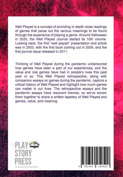 Well Played is a concept of providing in-depth close readings of video games that parse out the various meanings to be found in the experience of playing a game. Around Halloween in 2020, the Well Played Journal started its 10th volume. Looking back, the first "well played" presentation and article was in 2003, the first book came out in 2009, and the first journal issue was released in 2011. Thinking of Well Played during the pandemic underscored how games have been a part of our experiences and the value and role games have had in people's lives this past year or so. This Well Played retrospective and companion essays on games during the pandemic capture a critical history of Well Played and highlight how much games can matter in our lives. The retrospective and pandemic essays have resonant themes, so we've woven them together to share a written tapestry of Well Played and games, value, and meaning.