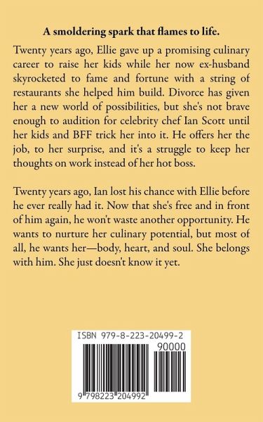 A smoldering spark that flames to life. Twenty years ago, Ellie gave up a promising culinary career to raise her kids while her now ex-husband skyrocketed to fame and fortune with a string of restaurants she helped him build. Divorce has given her a new world of possibilities, but she's not brave enough to audition for celebrity chef Ian Scott until her kids and BFF trick her into it. He offers her the job, to her surprise, and it's a struggle to keep her thoughts on work instead of her hot boss. Twenty years ago, Ian lost his chance with Ellie before he ever really had it. Now that she's free and in front of him again, he won't waste another opportunity. He wants to nurture her culinary potential, but most of all, he wants her-body, heart, and soul. She belongs with him. She just doesn't know it yet. The only thing hotter than the kitchen is the spark between these two mature characters. This is a sweet, steamy, succinct tale of two well-seasoned people, who find love after forty. Search Terms: contemporary romance, women's fiction, divorce fiction, later in life romance, steamy romance, second chance romance, mature romance, midlife romance