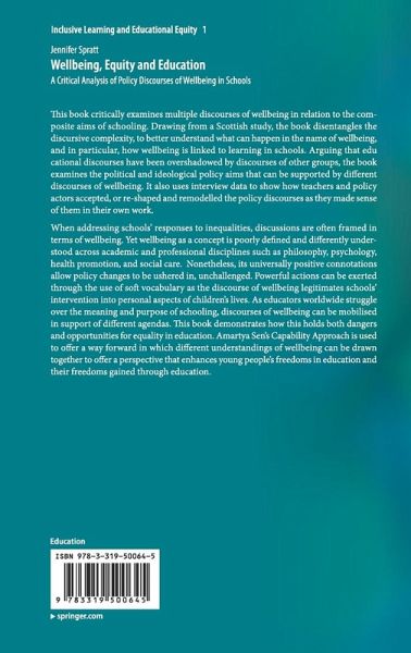 When addressing schools' responses to inequalities, discussions are often framed in terms of wellbeing. Yet wellbeing as a concept is poorly defined and differently understood across academic and professional disciplines such as philosophy, psychology, healthpromotion, and social care. Nonetheless, its universally positive connotations allow policy changes to be ushered in, unchallenged. Powerful actions can be exerted through the use of soft vocabulary as the discourse of wellbeing legitimates schools' intervention into personal aspects of children's lives. As educators worldwide struggle over the meaning and purpose of schooling, discourses of wellbeing can be mobilised in support of different agendas. This book demonstrates how this holds both dangers and opportunities for equality in education. Amartya Sen's Capability Approach is used to offer a way forward in which different understandings of wellbeing can be drawn together to offer a perspective that enhances young people's freedoms in education and their freedoms gained through education.