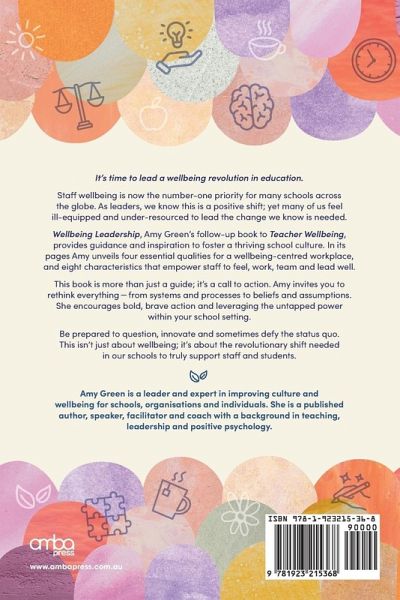 It's time to lead a wellbeing revolution in education. Staff wellbeing is now the number-one priority for many schools across the globe. As leaders, we know this is a positive shift; yet many of us feel ill-equipped and under-resourced to lead the change we know is needed. Wellbeing Leadership, Amy Green's follow-up book to Teacher Wellbeing, provides guidance and inspiration to foster a thriving school culture. In its pages Amy unveils four essential qualities for a wellbeing-centred workplace, and eight characteristics that empower staff to feel, work, team and lead well. This book is more than just a guide; it's a call to action. Amy invites you to rethink everything - from systems and processes to beliefs and assumptions. She encourages bold, brave action and leveraging the untapped power within your school setting. Be prepared to question, innovate and sometimes defy the status quo. This isn't just about wellbeing; it's about the revolutionary shift needed in our schools to truly support staff and students.