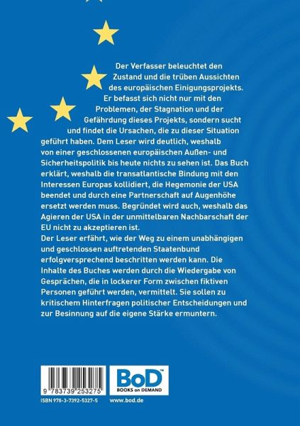 Der Verfasser beleuchtet den Zustand und die trüben Aussichten des europäischen Einigungsprojekts. Er befasst sich nicht nur mit den Problemen, der Stagnation und der Gefährdung dieses Projekts, sondern sucht und findet die Ursachen, die zu dieser Situation geführt haben. Dem Leser wird deutlich, weshalb von einer geschlossenen europäischen Außen- und Sicherheitspolitik bis heute nichts zu sehen ist. Das Buch erklärt, weshalb die transatlantische Bindung mit den Interessen Europas kollidiert, die Hegemonie der USA beendet und durch eine Partnerschaft auf Augenhöhe ersetzt werden muss. Begründet wird auch, weshalb das Agieren der USA in der unmittelbaren Nachbarschaft der EU nicht zu akzeptieren ist.Der Leser erfährt, wie der Weg zu einem unabhängigen und geschlossen auftretenden Staatenbund erfolgversprechend beschritten werden kann. Die Inhalte des Buches werden durch die Wiedergabe von Gesprächen, die in lockerer Form zwischen fiktiven Personen geführt werden, vermittelt. Sie sollen zu kritischem Hinterfragen politischer Entscheidungen und zur Besinnung auf die eigene Stärke ermuntern.