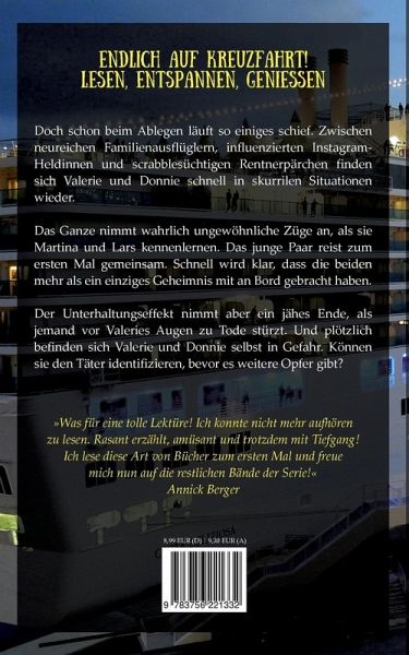 Endlich auf Kreuzfahrt! Lesen, entspannen, genießen.Doch schon beim Ablegen läuft so einiges schief. Zwischen neureichen Familienausflüglern, influenzierten Instagram-Heldinnen und scrabblesüchtigen Rentnerpärchen finden sich Valerie und Donnie schnell in skurrilen Situationen wieder.Das Ganze nimmt wahrlich ungewöhnliche Züge an, als sie Martina und Lars kennenlernen. Das junge Paar reist zum ersten Mal gemeinsam. Schnell wird klar, dass die beiden mehr als ein einziges Geheimnis mit an Bord gebracht haben.Der Unterhaltungseffekt nimmt aber ein jähes Ende, als jemand vor Valeries Augen zu Tode stürzt. Und plötzlich befinden sich Valerie und Donnie selbst in Gefahr. Können sie den Täter identifizieren, bevor es weitere Opfer gibt?