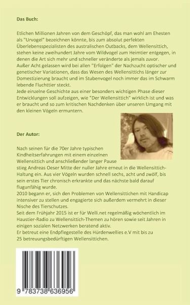 Etlichen Millionen Jahren von dem Geschöpf, das man wohl am Ehesten als "Urvogel" bezeichnen könnte, bis zum absolut perfekten Überlebensspezialisten des australischen Outbacks, dem Wellensittich, stehen keine zweihundert Jahre vom Wildvogel zum Heimtier entgegen, in denen die Art sich mehr und schneller veränderte als jemals zuvor.Außer Acht gelassen wird bei allen "Erfolgen" der Nachzucht optischer und genetischer Variationen, dass das Wesen des Wellensittichs länger zur Domestizierung braucht und im Stubenvogel noch immer das im Schwarm lebende Fluchttier steckt.Jede einzelne Geschichte aus einer besonders wichtigen Phase dieser Entwicklungen soll aufzeigen, wie "Der Wellensittich" wirklich ist und was er braucht und so zum kritischen Nachdenken über unseren Umgang mit den kleinen Vögeln ermuntern.