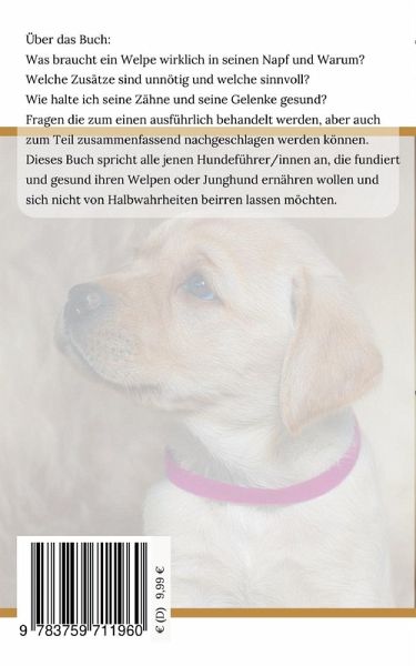 Über das Buch:Was braucht ein Welpe wirklich in seinen Napf und Warum?Welche Zusätze sind unnötig und welche sinnvoll?Wie halte ich seine Zähne und seine Gelenke gesund?Fragen die zum einen ausführlich behandelt werden, aber auch zum Teil zusammenfassend nachgeschlagen werden können. Dieses Buch spricht alle jenen Hundeführer/innen an, die fundiert und gesund ihren Welpen oder Junghund ernähren wollen und sich nicht von Halbwahrheiten beirren lassen möchten.
