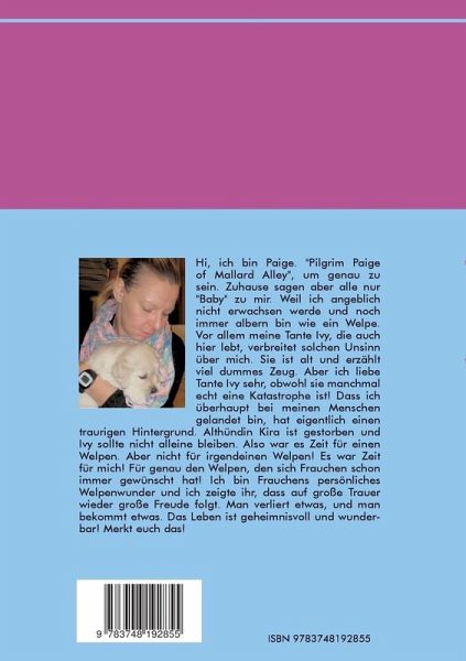Hi, ich bin Paige. "Pilgrim Paige of Mallard Alley", um genau zu sein. Ein Golden Retriever. Zuhause sagen aber alle nur "Baby" zu mir. Weil ich angeblich nicht erwachsen werde, und noch immer albern bin wie ein Welpe. Vor allem meine Tante Ivy, die auch hier lebt, verbreitet solchen Unsinn über mich. Sie ist alt und erzählt viel dummes Zeug. Aber ich liebe Tante Ivy sehr, obwohl sie manchmal echt eine Katastrophe ist! Dass ich überhaupt bei meinen Menschen gelandet bin, hat eigentlich einen traurigen Hintergrund. Althündin Kira ist gestorben und Ivy sollte nicht alleine bleiben. Also war es Zeit für einen Welpen. Aber nicht für irgendeinen Welpen! Es war Zeit für mich! Für genau den Welpen, den sich Frauchen schon immer gewünscht hat! Ich bin Frauchens persönliches Welpenwunder und ich zeigte ihr, dass auf große Trauer wieder große Freude folgt. Man verliert etwas, und man bekommt etwas. Das Leben ist geheimnisvoll und wunderbar! Merkt euch das!