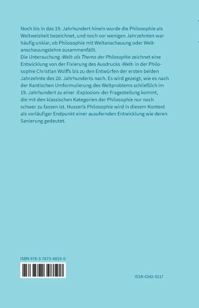 Noch bis in das 19. Jahrhundert hinein wurde die Philosophie als Weltweisheit bezeichnet, und noch vor wenigen Jahrzehnten war häufig unklar, ob Philosophie mit Weltanschauung oder Weltanschauungslehre zusammenfällt. Die Untersuchung "'Welt' als Thema der Philosophie" zeichnet eine Entwicklung von der Fixierung des Ausdrucks 'Welt' in der Philosophie Christian Wolffs bis zu den Entwürfen der ersten beiden Jahrzehnte des 20. Jahrhunderts nach. Es wird gezeigt, wie es nach der Kantischen Umformulierung des Weltproblems schließlich im 19. Jahrhundert zu einer 'Explosion' der Fragestellung kommt, die mit den klassischen Kategorien der Philosophie nur noch schwer zu fassen ist. Husserls Philosophie wird in diesem Kontext als vorläufiger Endpunkt einer ausufernden Entwicklung wie deren Sanierung gedeutet.