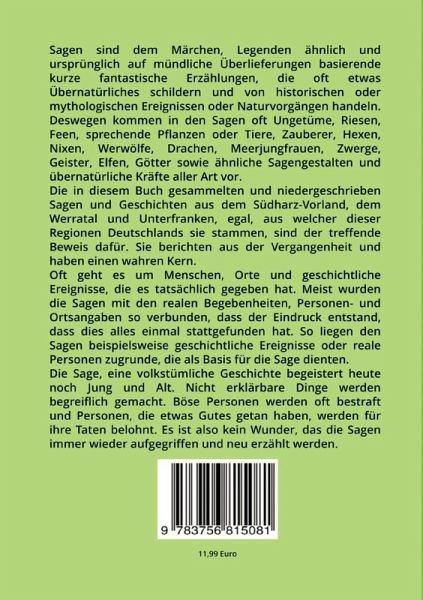 Sagen sind Märchen, Legenden ähnlich und ursprünglich Überlieferungen basierende kurze fantastische Erzählungen, die oft etwas Übernatürliches schildern und von historischen oder mythologischen Ereignissen oder Naturvorgängen handeln. Deswegen kommen in den Sagen oft Ungetüme, Riesen, Feen, Nixen, Werwölfe, Drachen, Meerjungfrauen, Zwerge, Geister, Elfen, Götter sowie ähnliche Sagengestalten und übernatürliche Kräfte aller Art vor. Die in diesem Buch gesammelten und niedergeschriebenen Sagen und Geschichten aus dem Südharz-Vorland, dem Werratal und Unterfranken, egal, aus welcher dieser Regionen Deutschlands sie stammen, sie sind der treffende Beweis dafür. Sie berichten aus der Vergangenheit und haben einen wahren Kern. Oft geht es um Menschen, Orte und geschichtliche Ereignisse, die es tatsächlich gegeben hat. Meist wurden die Sagen mit den realen Begebenheiten, Personen- und Ortsangaben so verbunden, das der Eindruck entstand, dass dies alles einmal stattgefunden hat. So liegen den Sagen beispielsweise geschichtliche Ereignisse oder reale Personen zugrunde, die als Basis für die Sage diente. Die Sage eine volkstümliche Geschichte begeistert heute noch Jung und Alt. Nicht erklärbare Dinge werden begreiflich gemacht. Böse Personen werden oft bestraft und Personen, die etwas Gutes getan haben, werden für ihre Taten belohnt. Es ist also kein Wunder, das die Sagen immer wieder aufgegriffen und neu erzählt werden.