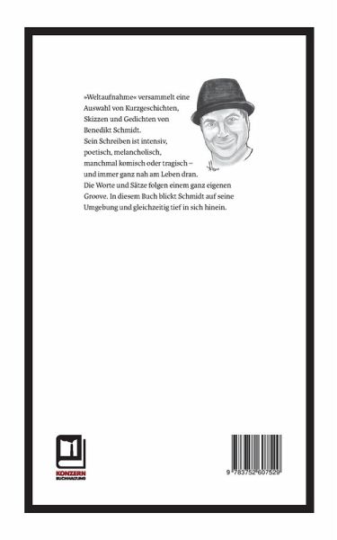 "Weltaufnahme" versammelt eine Auswahl von Kurzgeschichten, Skizzen und Gedichten von Benedikt Schmidt. Sein Schreiben ist intensiv, poetisch, melancholisch, manchmal komisch oder tragisch - und immer ganz nah am Leben dran. Die Worte und Sätze folgen einem ganz eigenen Groove. In diesem Buch blickt Schmidt auf seine Umgebung und gleichzeitig tief in sich hinein.
