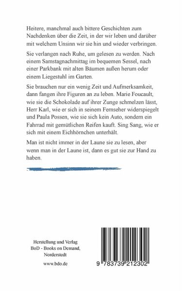 Heitere, manchmal auch bittere Geschichten zum Nachdenken über die Zeit, in der wir leben und darüber, mit welchem Unsinn wir sie hin und wieder verbringen.Sie verlangen nach Ruhe, um gelesen zu werden. Nach einem Samstagnachmittag im bequemen Sessel, nach einer Parkbank mit alten Bäumen außen herum oder einem Liegestuhl im Garten.Sie brauchen nur ein wenig Zeit und Aufmerksamkeit, dann fangen ihre Figuren an zu leben. Marie Foucault, wie sie die Schokolade auf ihrer Zunge schmelzen lässt, Herr Karl, wie er sich in seinem Fernseher widerspiegelt und Paula Possen, wie sie sich kein Auto, sondern ein Fahrrad mit gemütlichen Reifen kauft. Sing Sang, wie er sich mit einem Eichhörnchen unterhält.