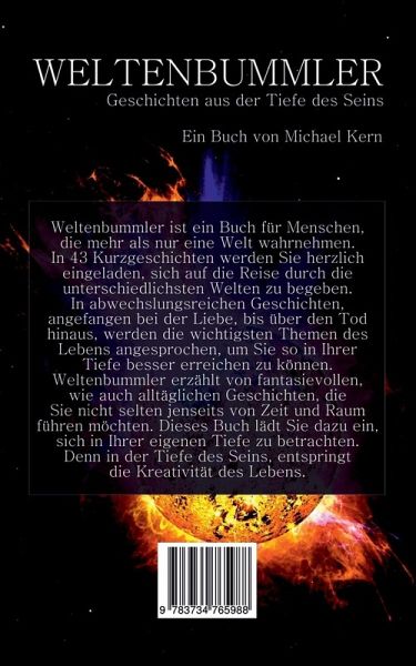 Weltenbummler ist ein Buch für Menschen, die mehr als nur eine Welt wahrnehmen. In 43 Kurzgeschichten werden Sie herzlich eingeladen, sich auf die Reise durch die unterschiedlichsten Welten zu begeben. In abwechslungsreichen Geschichten, angefangen bei der Liebe, bis über den Tod hinaus, werden die wichtigsten Themen des Lebens angesprochen, um Sie so in Ihrer Tiefe besser erreichen zu können. Weltenbummler erzählt von fantasievollen, wie auch alltäglichen Geschichten, die Sie nicht selten jenseits von Zeit und Raum führen möchten. Dieses Buch lädt Sie dazu ein, sich in Ihrer eigenen Tiefe zu betrachten. Denn in der Tiefe des Seins, entspringt die Kreativität des Lebens.