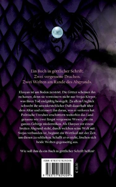 Ein Buch in göttlicher Schrift. Zwei vergessene Drachen. Zwei Welten am Rande des Abgrunds.Elusyan ist am Boden zerstört. Die Götter scheinen ihn zu hassen, denn sie versteinern nicht nur Svejas Körper, was ihren Tod endgültig besiegelt. Zu allem Unglück schwebt ihr unwiderstehlicher Duft dauerhaft über dem Altar und erinnert ihn daran, was er verloren hat. Politische Unruhen erschüttern weiterhin das Land genauso wie zwei längst vergessene Wesen, die ein ganzes Gebirge niederreißen. Als Elusyan vor einem breiten Abgrund steht, durch welchen seine Welt mit Svejas verbunden ist, beginnt ein Wettlauf mit der Zeit, um diesen zu schließen. Schafft er es nicht, löschen sich beide Welten gegenseitig aus.Wie soll ihm da ein Buch in göttlicher Schrift helfen?