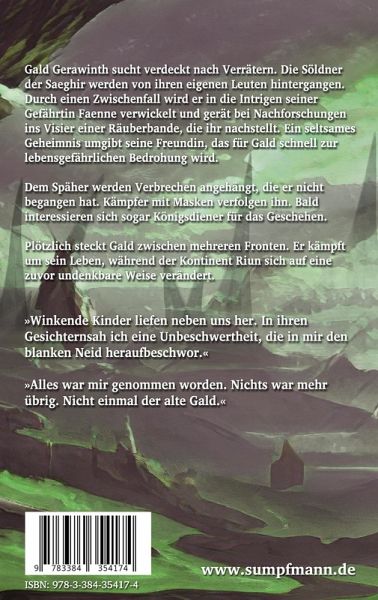 Gald Gerawinth sucht verdeckt nach Verrätern. Die Söldner der Saeghir werden von ihren eigenen Leuten hintergangen. Durch einen Zwischenfall wird Gald in die Intrigen seiner Gefährtin Faenne verwickelt und gerät bei Nachforschungen ins Visier einer Räuberbande, die ihr nachstellt. Ein seltsames Geheimnis umgibt seine Freundin, das für ihn schnell zur lebensgefährlichen Bedrohung wird.Dem Späher werden Verbrechen angehängt, die er nicht begangen hat. Kämpfer mit Masken verfolgen ihn. Bald interessieren sich sogar Königsdiener für das Geschehen.Plötzlich steckt Gald zwischen mehreren Fronten. Er kämpft um sein Leben, während sich der Kontinent Riun auf eine zuvor undenkbare Weise verändert.
