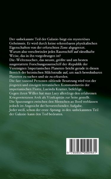 Der 'unbekannte Teil der Galaxie' birgt ein mysteriöses Geheimnis. Er wird durch keine erkennbaren physikalischen Eigenschaften von der erforschten Zone abgegrenzt. Warum also verschwindet jedes Raumschiff auf rätselhafte Weise, das in ihn vorgedrungen ist?Die 'Weltensucher', das neuste, größte und am besten ausgestattete Forschungsraumschiff der 'Republik der Vereinigten Imperianischen Planeten' bricht in diesen Bereich der heimischen Milchstraße auf, um nach bewohnbaren Planeten zu suchen und sie zu erkunden. Kapitän des Schiffes ist Lucinda Kramer oder kurz 'Lucy', wie sie von ihrer Mannschaft genannt wird, die jüngste und einzige terranische Kommandantin der Flotte der Republik.Gleich der erste 'Sprung' in diesen Teil der Galaxie katapultiert sie an einen Ort, den sie nicht für möglich gehalten hätten. Ihre gesamte Energie richtet sich auf die beiden Ziele, zu überleben und einen Weg zurück zu finden.---------------------------------------'Weltensucher' ist eine Science-Fiction-Serie. Einerseits ist sie als Nachfolge der Serie 'Lucy' konzipiert. So werden Lucy-Fans viele ihrer Lieblingscharaktere wiederfinden und an ihrer weiteren Entwicklung teilhaben können. Andererseits ist sie so aufgebaut, dass auch 'Neueinsteiger' mit Band 1 beginnen können. Die Kenntnisse der Vorgeschichte aus der Lucy-Serie sind zwar nützlich, aber zum Verständnis der Handlung nicht notwendig.Anders als die Serie 'Lucy' ist sie nicht als Jugendbuch geschrieben worden. Sie enthält aber keine Elemente, die eine Altersbeschränkung notwendig machen würden, sodass sie auch jugendlichen Science-Fiction-Fans ans Herz gelegt werden kann.