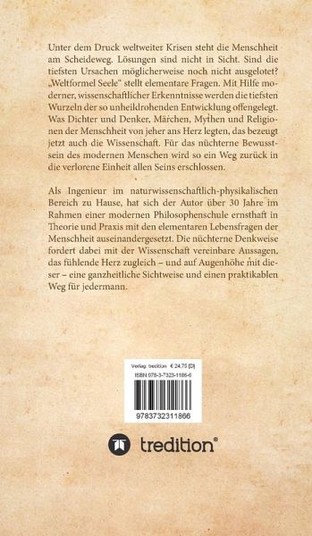 Unter dem Druck weltweiter Krisen steht die Menschheit am Scheideweg. Lösungen sind nicht in Sicht. Sind die tiefsten Ursachen möglicherweise noch nicht ausgelotet? "Weltformel Seele" stellt elementare Fragen. Mit Hilfe aktueller wissenschaftlicher Erkenntnisse werden die tiefsten Wurzeln der so unheildrohenden Entwicklung offengelegt.