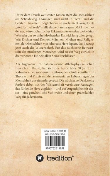 Unter dem Druck weltweiter Krisen steht die Menschheit am Scheideweg. Lösungen sind nicht in Sicht. Sind die tiefsten Ursachen möglicherweise noch nicht ausgelotet? "Weltformel Seele" stellt elementare Fragen. Mit Hilfe aktueller wissenschaftlicher Erkenntnisse werden die tiefsten Wurzeln der so unheildrohenden Entwicklung offengelegt.