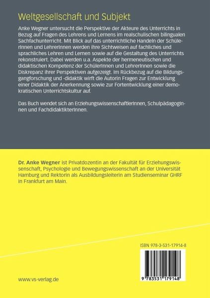 Anke Wegner untersucht die Perspektive der Akteure des Unterrichts in Bezug auf Fragen des Lehrens und Lernens im realschulischen bilingualen Sachfachunterricht. Mit Blick auf das unterrichtliche Handeln der SchülerInnen und LehrerInnen werden ihre Sichtweisen auf fachliches und sprachliches Lehren und Lernen sowie auf die Gestaltung des Unterrichts rekonstruiert. Dabei werden u.a. Aspekte der hermeneutischen und didaktischen Kompetenz der SchülerInnen und LehrerInnen sowie die Diskrepanz ihrer Perspektiven aufgezeigt. Im Rückbezug auf die Bildungsgangforschung und -didaktik wirft die Autorin Fragen zur Entwicklung einer Didaktik der Anerkennung sowie zur Fortentwicklung einer demokratischen Unterrichtskultur auf.
