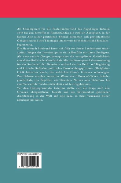 Als Sondergesetz für die Protestanten fand das Augsburger Interim 1548 bei den betroffenen Reichsständen nie wirklich Akzeptanz. In der kurzen Zeit seiner politischen Brisanz bemühten sich protestantische Obrigkeiten und ihre Theologen intensiv um kirchenpolitische Schadensbegrenzung. Dieses Ringen steht im Mittelpunkt des Buchs. Jenseits der großen politischen und theologischen Protagonisten der Interimskrise bildet die Hansestadt Stralsund den Hauptgegenstand der Arbeit. Als Mitglied der wendischen Hanse hatte sie sich früh von ihrem Landesherrn emanzipiert. Wegen des Interims geriet sie nun in Konflikt mit ihren Predigern. In dieser spezifischen Situation mit ihren verschiedenen Akteuren und Konstellationen konkretisieren sich anhand lokaler Netzwerke, familiärer Beziehungen und verfassungspolitischer Konstanten Argumentationsstrukturen und Verhaltensmuster der Konfliktparteien innerhalb des politischen Gesamtgeschehens. Als neue soziale Gruppe beanspruchte die evangelische Geistlichkeit eine aktive Rolle in der Gesellschaft. Mit der Fürsorge und Verantwortung für das Seelenheil der Gemeinde verband sie das Recht auf Begleitung und kritische Reflexion politischer Entscheidungsprozesse. Obrigkeitskritik bedeutete damit, der weltlichen Gewalt Grenzen aufzuzeigen. Zur Debatte standen normative Werte der frühneuzeitlichen Ständegesellschaft, von Begriffen wie Gemeiner Nutzen oder Gehorsam bis zum Vorwurf der Widersetzlichkeit und des Ungehorsams. Vor dem Hintergrund des Interims stellte sich die Frage nach den Grenzen obrigkeitlicher Gewalt und der Wirksamkeit geistlicher Amtsführung in der Welt auf eine neue, in ihrer Vehemenz bisher unbekannten Weise.