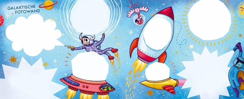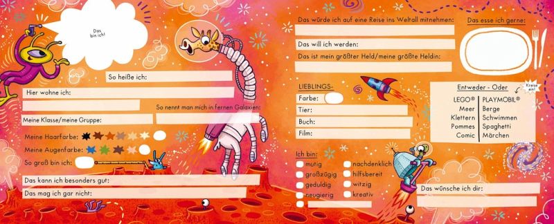 Auf den 64 bunt illustrierten Seiten können du und deine Freund_innen sich verewigen: Was würdest du auf eine Reise ins Weltall mitnehmen? Wie sieht dein Traum-Raumschiff aus? Würdest du lieber eine Mondwanderung machen oder mit Aliens zu Mittag essen?