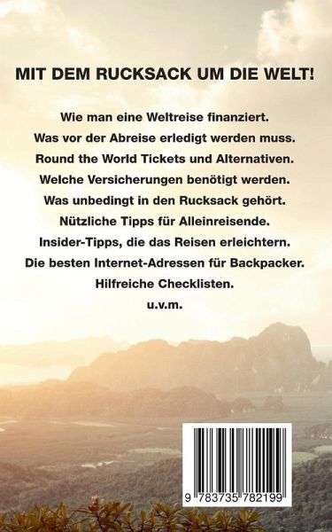 Weltreisen und Langzeitreisen liegen im Trend. Jedes Jahr zieht Abenteuerlust Millionen Menschen ins Unbekannte. Immer mehr junge Leute nutzen die Möglichkeit, durch kostengünstige Reisemöglichkeiten und Unterkünfte fremde Länder zu bereisen. Viele gönnen sich eine Auszeit im Job oder während des Studiums, andere überbrücken Wartezeiten an der Universität oder nutzen die Chance, vor Arbeitsbeginn neue Erfahrungen im Ausland zu sammeln. Damit der Start ins Abenteuer ohne Probleme verläuft, muss einiges durchdacht und beachtet werden. Die Vorbereitung ist umfangreich aber nicht schwierig.Das Buch "Weltreise - Handbuch zur Reisevorbereitung" zeigt, wie eine Weltreise vorbereitet wird. Von der Reiseplanung bis zur Rückkehr werden alle wichtigen Fragen und Themen wie Round the World Tickets, Reiseversicherung, Ausrüstung, Unterkünfte, Transportmöglichkeiten, u.v.m. behandelt. Durch selbst gemachte Erfahrungen und Tipps von anderen Backpackern ist ein umfangreiches Handbuch entstanden,das Schritt für Schritt erklärt, wie der Traum von einer Weltreise wahr wird.