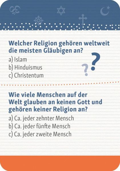 Zu jeder Frage gibt es die richtige Antwort mit einer kurzen Erklärung auf der Rückseite der Karten. So lernen Mädchen und Jungen ab 8 Jahren spielerisch, was die Religionen ausmacht, welche Bräuche und Traditionen es gibt, und dass die Gläubigen neben allen Unterschieden auch sehr viel verbindet.