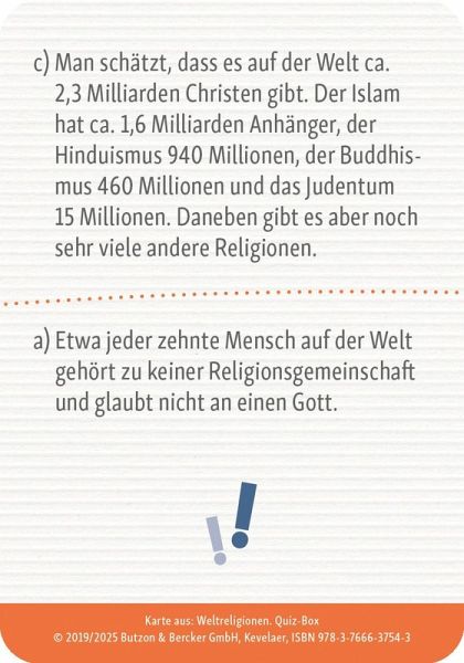 Welcher Gott hat den Kopf eines Elefanten? Was findet man in jeder christlichen Kirche? Welcher Berg ist den Japanern heilig? Was feiern Muslime am Zuckerfest? Und wie begrüßen sich Juden? Diese Quizbox bietet über 90 Fragen zu den fünf großen Weltreligionen Hinduismus, Buddhismus, Judentum, Christentum und Islam.
