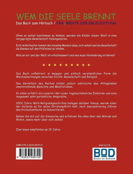 Ohne es selbst bestimmen zu können, werden die Kinder dieser Welt in eine vorgeprägte Gesellschaft hineingeboren.Erst im Reifealter kommt der einzelne Mensch dazu, sich selbst und die Gesellschaft als Ganzes auf den Prüfstand zu stellen.Was an mir und der Welt ist erhaltenswert und was muss Veränderung erfahren?Das Buch reflektiert in knapper und einfach verständlicher Form die Wechselwirkungen zwischen Politik, Gesellschaft und Religion.Das Kernstück des Buches bilden jedoch zahlreiche das Alltagsleben umschreibende Gedichte und Meditationen.In allem erfährt die Leserin/der Leser tagebuchähnliche Einblicke und eine insgesamt sehr persönliche Ansprache.3000 Jahre Welt-Religionsgeschichte belegen darüber hinaus, warum einer der Autoren es für seine Christenpflicht hält, nach zweiundvierzig Jahren des Protestantseins zu konvertieren.Gehen Sie mit auf die Sinnsuche und erfahren Sie alles über das Warum und Wohin, sowie mehr über sich selbst.Zum lesen empfohlen ab 15 Jahre
