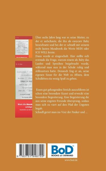 Über sechs Jahre lang war es seine Mutter, zu der er aufschaute, die ihn als easycare Baby bezeichnete und bei der er schnell mit seinem recht lauten Mundwerk die Worte NEIN oder ICH WILL lernte.Dann wurde er eingeschult. Hier stellte sich erstmals die Frage, warum einem als Baby das Laufen und Sprechen beigebracht wurde, während man nun in der Schule ruhig und stillzusitzen hatte. Dennoch fing er an, seine eigenen Sinne für die Welt zu öffnen, dem Schulleben ein wenig Spaß zu geben, den Unterricht einfach durch ein paar Streiche aufzupeppen.Einen gut gelungenen Streich auszuführen ist schon eine besondere Kunst und erweckt eine besondere Begeisterung. Eine Begeisterung die auch seine engsten Freunde übersprang, sodass man sich zu viert auf den Pfad der Untugend begab.Schnell geriet man ins Visier der Pauker und so musste man seine Possen von jemand anders durchführen lassen und wer kam da am besten infrage, als der Musterschüler aus der ersten Reihe? Frei nach der Devise: Streiche machen ist lustig, besonders wenn es ein anderer für dich tut.
