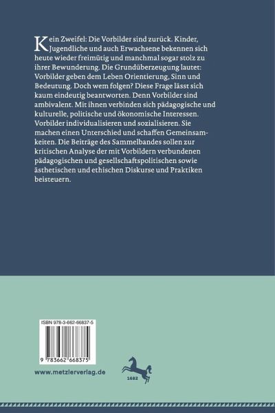 1 Einleitung.- Teil I.- 2 Das Vorbild als pädagogisches Problem.- 3 Vorbilderziehung als pädagogische Manipulation. Ethisch-ästhetische Aspekte einer Form der Beeinflussung.- 4 Große Männer und wichtige Ideen - Funktionen von Vorbildern in Geschichten der Pädagogik.- 5 "Man kann ja nicht überall Vorbild sein". Ehemalige Extremist/innen zwischen Klassenzimmern und sozialen Medien.- 6 Influencer, Christfluencer, Sinnfluencer: Das didaktische Potenzial von Selbstpräsentationen in digitalen Welten.- 7 'Sei Pippi, nicht Annika'. Über merkwürdige Vorbilder in der Pädagogik.- 8 Von Lionel Messi bis Serena Williams. Spitzensportler*innen als Vorbilder in den sozialen Medien.- Teil II.- 9 Influencer: Der Werbekörper als Vorbild.- 10 Die Aneignung von Vorbildern im Anthropozän. Mimetische, rituelle und gestische Prozesse.- 11 (K)ein Vorbild? Zur Bedeutung von Role Models in der Klimabewegung.- 12 Change Agents - Vorbilder für eine sozial-ökologische Transformation oder kritische Beeinflussung von Jugendlichen?.- 13 Beispiellos Beispielhaftes. Zu Vorbildern in autobiographischen Erinnerungstexten von Überlebenden der Shoah und des Tutsizids in Ruanda.- 14 Außergewöhnlich normal. Heroismen der Organisation und ihre historische Transformation.- 15 Vorbildhafter Geschichtsunterricht? Historische Vorbilder und ihre Funktion im Geschichtsunterricht in den 1950er- und 1960er-Jahren.- 16 Karl Jaspers´ "Maßgebende Menschen" - interkulturelle Vorbilder?.- Teil III.- 17 Männerfasten. Über Schriftstellerinnen als Vorbilder.- 18 James Bond - Geheimagent, Filmheld. Vorbild?.- 19 Das Vorbild in Nicolas Philiberts "Sein und Haben".- 20 Im medialen Spiegel weiblicher Alltäglichkeiten - Komikerinnen und die Inszenierung des Gewöhnlichen.- 21 Im Zeichen des Geschlechts. Männliche Erzieher als Vorbilder im Kindergarten.- 22 Stars als Vorbilder? Die Vorbildwirkung darstellender Künstler*innen im deutschsprachigen Theaternetzwerk 1850-1950.