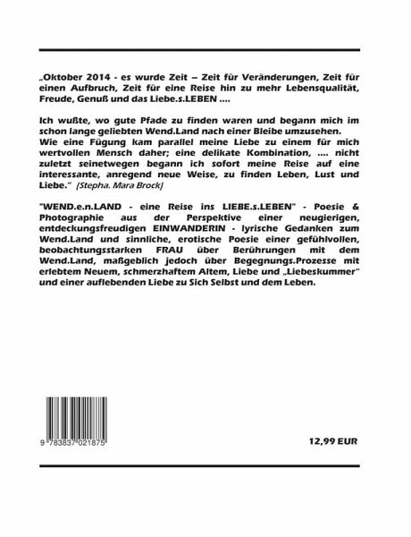 "WEND.e.n.LAND - eine Reise ins LIEBE.s.LEBEN" - POESIE & PHOTOGRAPHIE aus der Perspektive einer neugierigen, entdeckungsfreudigen EINWANDERIN - lyrische Gedanken zum Wend.Land und sinnliche, erotische Poesie einer gefühlvollen, beobachtungsstarken FRAU über Berührungen mit dem Wend.Land, maßgeblich jedoch über BegegnungsProzesse mit erlebtem Neuem, schmerzhaftem Altem, Liebe und "Liebeskummer" und einer auflebenden Liebe zu Sich Selbst und dem Leben. Das alles hat beflügelt und möchte weitergegeben werden.Auf der Reise, ist Erlebtes, Beobachtungen, Emotionen und Gedanken vor allem in Poesie gesammelt - diese begleiten durch dieses Buch.Von den parallel eingefangenen Photographien der Reise sind nur wenige im Buch; sie sind größten Teils in der gleichnamigen Ausstellung "WEND.e.n.LAND - eine Reise ins LIEBE.s.LEBEN" zu sehen.