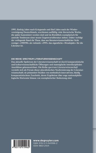 1995, fünfzig Jahre nach Kriegsende und fünf Jahre nach der Wiedervereinigung Deutschlands, erschienen auffällig viele literarische Werke, die später kanonisiert wurden, wie zum Beispiel: Christian Krachts "Faserland", Feridun Zaimoglus "Kanak Sprak", Thomas Brussigs "Helden wie wir", Reinhard Jirgls "Abschied von den Feinden", Bernhard Schlinks "Der Vorleser", Elfriede Jelineks "Die Kinder der Toten" oder Günter Grass' Roman "Ein weites Feld", der eine heftige, den deutsch-deutschen Literaturstreit fortsetzende Debatte auslöste. Aber auch in anderen Gattungen und auf anderen Gebieten gab es wichtige Ereignisse und Veränderungen: Ende 1995 starb Heiner Müller und das postdramatische Theater wandte sich zunehmend den sozialen Geschichten der Gegenwart zu. In der Lyrik erhielt Durs Grünbein den Büchner-Preis. Schließlich war Österreich Gastland der Frankfurter Buchmesse und präsentierte junge Autoren, die die künftige Stärke der österreichischen Gegenwartsliteratur ankündigten.Der vorliegende Band vertritt daher die These, dass aus literaturwissenschaftlicher Sicht weniger "1989/90" als vielmehr "1995" das eigentliche "Wendejahr" für die Literatur ist.