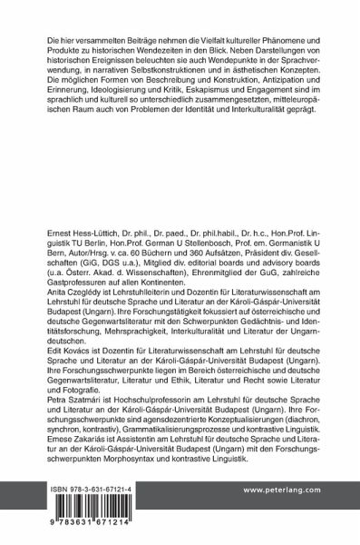 Ernest W.B. Hess-Lüttich, Dr. phil., Dr. paed., Dr. phil.habil., Dr. h.c., Hon.Prof. Linguistik TU Berlin, Hon.Prof. German U Stellenbosch, Prof. em. Germanistik U Bern, Autor/Hrsg. v. ca. 60 Büchern und 360 Aufsätzen, Präsident div. Gesellschaften (GiG, DGS u.a.), Mitglied div. editorial boards und advisory boards (u.a. Österr. Akad. d. Wissenschaften), Ehrenmitglied der GuG, zahlreiche Gastprofessuren auf allen Kontinenten. Anita Czeglédy ist Lehrstuhlleiterin und Dozentin für Literaturwissenschaft am Lehrstuhl für deutsche Sprache und Literatur an der Károli-Gáspár-Universität Budapest (Ungarn). Ihre Forschungstätigkeit fokussiert auf österreichische und deutsche Gegenwartsliteratur mit den Schwerpunkten Gedächtnis- und Identitätsforschung, Mehrsprachigkeit, Interkulturalität und Literatur der Ungarndeutschen. Edit Kovács ist Dozentin für Literaturwissenschaft am Lehrstuhl für deutsche Sprache und Literatur an der Károli-Gáspár-Universität Budapest (Ungarn). Ihre Forschungsschwerpunkte liegen im Bereich österreichische und deutsche Gegenwartsliteratur, Literatur und Ethik, Literatur und Recht sowie Literatur und Fotografie. Petra Szatmári ist Hochschulprofessorin am Lehrstuhl für deutsche Sprache und Literatur an der Károli-Gáspár-Universität Budapest (Ungarn). Ihre Forschungsschwerpunkte sind agensdezentrierte Konzeptualisierungen (diachron, synchron, kontrastiv), Grammatikalisierungsprozesse und kontrastive Linguistik. Emese Zakariás ist Assistentin am Lehrstuhl für deutsche Sprache und Literatur an der Károli-Gáspár-Universität Budapest (Ungarn) mit den Forschungsschwerpunkten Morphosyntax und kontrastive Linguistik.