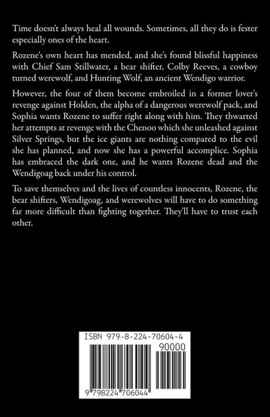 Time doesn't always heal all wounds. Sometimes, all they do is fester especially ones of the heart. Rozene's own heart has mended, and she's found blissful happiness with Chief Sam Stillwater, a bear shifter, Colby Reeves, a cowboy turned werewolf, and Hunting Wolf, an ancient Wendigo warrior. However, the four of them become embroiled in a former lover's revenge against Holden, the alpha of a dangerous werewolf pack, and Sophia wants Rozene to suffer right along with him. They thwarted her attempts at revenge with the Chenoo which she unleashed against Silver Springs, but the ice giants are nothing compared to the evil she has planned, and now she has a powerful accomplice. Sophia has embraced the dark one, and he wants Rozene dead and the Wendigoag back under his control. To save themselves and the lives of countless innocents, Rozene, the bear shifters, Wendigoag, and werewolves will have to do something far more difficult than fighting together. They'll have to trust each other.