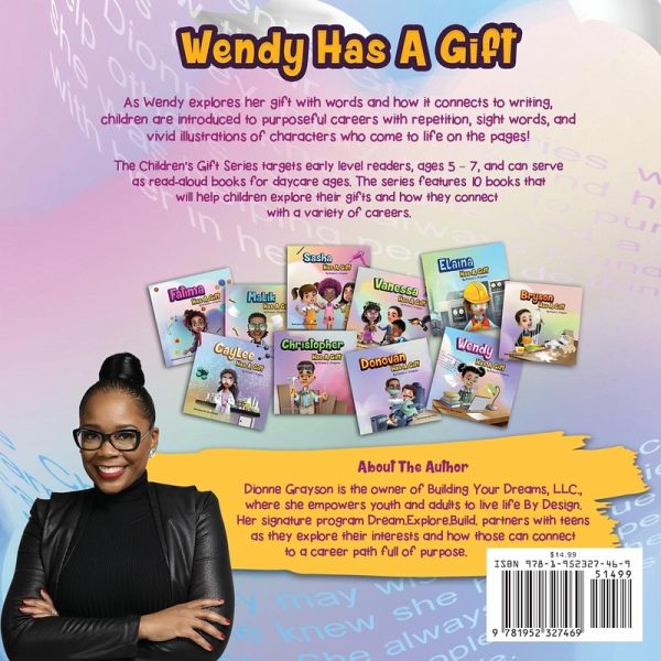 As Wendy explores her gift with words and how it connects to writing, children are introduced to purposeful careers with repetition, sight words, and vivid illustrations of characters who come to life on the pages! The Children's Gift Series targets early level readers, ages 5 - 7, and can serve as read-aloud books for daycare ages. The series features 10 books that will help children explore their gifts and how they connect with a variety of careers.