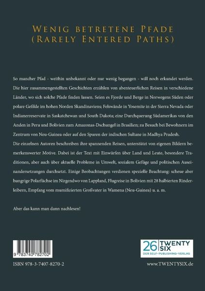 So mancher Pfad - weithin unbekannt oder nur wenig begangen - will noch erkundet werden. Die hier zusammengestellten Geschichten erzählen von abenteuerlichen Reisen in verschiedene Länder, wo sich solche Pfade finden lassen. Seien es Fjorde und Berge in Norwegens Süden oder polare Gefilde im hohen Norden Skandinaviens; Felswände in Yosemite in der Sierra Nevada oder Indianerreservate in Saskatchewan und South Dakota; eine Durchquerung Südamerikas von den Anden in Peru und Bolivien zum Amazonas-Dschungel in Brasilien; zu Besuch bei Bewohnern im Zentrum von Neu-Guinea oder auf den Spuren der indischen Sultane in Madhya Pradesh. Die einzelnen Autoren beschreiben ihre Reisen in anschaulicher Weise, unterstützt von ihren eigenen Bildern bemerkenswerter Motive. Dabei ist der Text mit Einwürfen über Land und Leute, besondere Traditionen, aber auch über aktuelle Probleme in Umwelt, sozialem Gefüge und politische Auseinandersetzungen durchsetzt. Einige Beobachtungen verdienen spezielle Beachtung: scheue, aber hungrige Polarfüchse im Nirgendwo von Lappland, Flugreise in Bolivien mit 28 halbierten Rinderleibern, Empfang vom mumifizierten Großvater in Wamena (Neu-Guinea) u. a. m.Aber das kann man dann nachlesen!There are many paths - mostly unknown and only rarely entered - that still want to be explored. The stories collected here tell us about adventurous travels to different countries, where one can find such paths. Be it fjords and mountains in the South of Norway or polar regions in the far North of Scandinavia; rock faces in Yosemite in the Sierra Nevada or reservations for American Natives in Saskatchewan and South Dakota; traversing South America from the Andes in Peru and Bolivia to t Amazon rainforest; visiting inhabitants and local tribes of central New-Guinea or following the traces of Indian sultans in Madhya Pradesh. The individual authors describe their travels in a vivid way, supported by their own photographs of remarkable objects and scenes. The text is permeated with inserts about land and people, noticeable traditions, and also with actual problems in terms of environment, social structure and political debates. Some observations deserve special attention: hungry polar foxes out of nowhere in Lapland, air travel in Bolivia with 28 halves of slaughtered cows, reception by the mummified grandfather in Wamena (New-Guinea), and more...But all this can be read in the book!
