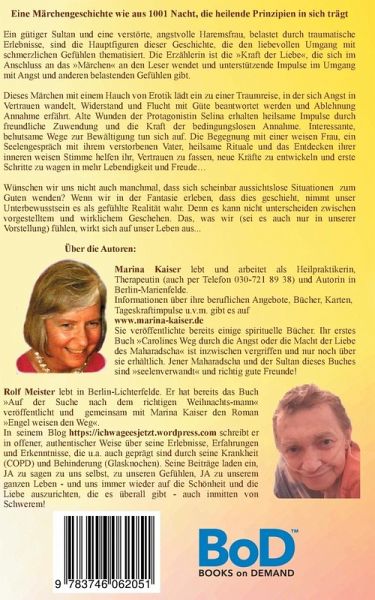 Eine Märchengeschichte wie aus 1001 Nacht, die heilende Prinzipien in sich trägt:Ein gütiger Sultan und eine verstörte, angstvolle Haremsfrau, belastet durch traumatische Erlebnisse, sind die Hauptfiguren dieser Geschichte, die den liebevollen Umgang mit schmerzlichen Gefühlen thematisiert. Die Erzählerin ist die "Kraft der Liebe", die sich im Anschluss an das "Märchen" an den Leser wendet und unterstützende Impulse im Umgang mit Angst und anderen belastenden Gefühlen gibt.Dieses Märchen lädt ein zu einer Traumreise, in der sich Angst in Vertrauen wandelt, Widerstand und Flucht mit Güte beantwortet werden und Ablehnung Annahme erfährt. Alte Wunden der Protagonistin Selina erhalten heilsame Impulse durch freundliche Zuwendung und die Kraft der bedingungslosen Annahme. Interessante, behutsame Wege zur Bewältigung ihrer Ängste tun sich auf. Die Begegnung mit einer weisen Frau, ein Seelengespräch mit ihrem verstorbenen Vater, heilsame Rituale und das Entdecken ihrer inneren weisen Stimme helfen ihr, Vertrauen zu fassen, neue Kräfte zu entwickeln und erste Schritte zu wagen in mehr Lebendigkeit und Freude ...