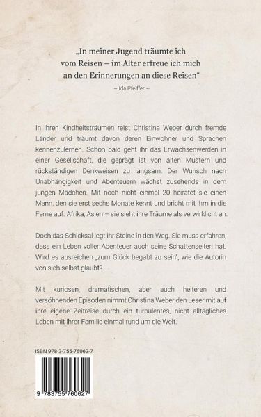 In ihren Kindheitsträumen reist Christina Weber durch fremde Länder und träumt davon deren Einwohner und Sprachen kennenzulernen. Schon bald geht ihr das Erwachsenwerden in einer Gesellschaft, die geprägt ist von alten Mustern und rückständigen Denkweisen zu langsam. Der Wunsch nach Unabhängigkeit und Abenteuern wächst zusehends in dem jungen Mädchen. Mit noch nicht einmal 20 heiratet sie einen Mann, den sie erst sechs Monate kennt und bricht mit ihm in die Ferne auf. Afrika, Asien - sie sieht ihre Träume als verwirklicht an.Doch das Schicksal legt ihr Steine in den Weg. Sie muss erfahren, dass ein Leben voller Abenteuer auch seine Schattenseiten hat. Wird es ausreichen "zum Glück begabt zu sein", wie die Autorin von sich selbst glaubt?Mit kuriosen, dramatischen, aber auch heiteren und versöhnenden Episoden nimmt Christina Weber den Leser mit auf ihre eigene Zeitreise durch ein turbulentes, nicht alltägliches Leben mit ihrer Familie einmal rund um die Welt.