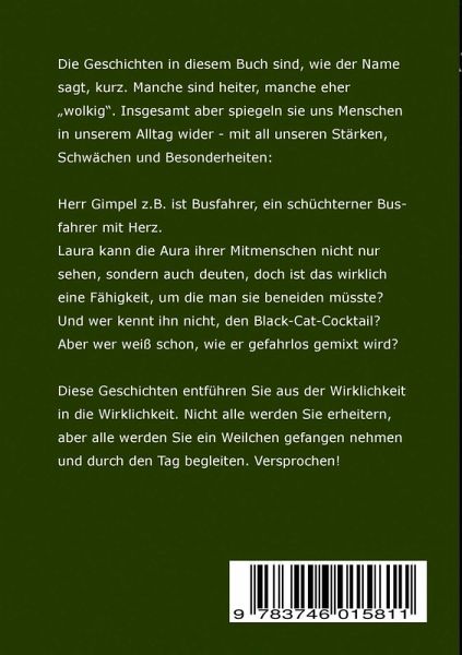 Die Geschichten in diesem Buch sind, wie der Name sagt, kurz. Manche sind heiter, manche eher wolkig. Insgesamt aber spiegeln sie uns Menschen in unserem Alltag wider - mit all unseren Stärken, Schwächen und Besonderheiten:Herr Gimpel z.B. ist Busfahrer, ein schüchterner Busfahrer mit Herz;Laura kann die Aura ihrer Mitmenschen nicht nur sehen, sondern auch deuten, doch ist das wirklich eine Fähigkeit, um die man sie beneiden müsste?Und wer kennt ihn nicht, den Black-Cat-Cocktail? Aber wer weiß schon, wie er gefahrlos gemixt wird?Diese Geschichten entführen Sie aus der Wirklichkeit in die Wirklichkeit. Nicht alle werden Sie erheitern, aber alle werden Sie ein Weilchen gefangen nehmen und durch den Tag begleiten. Versprochen!