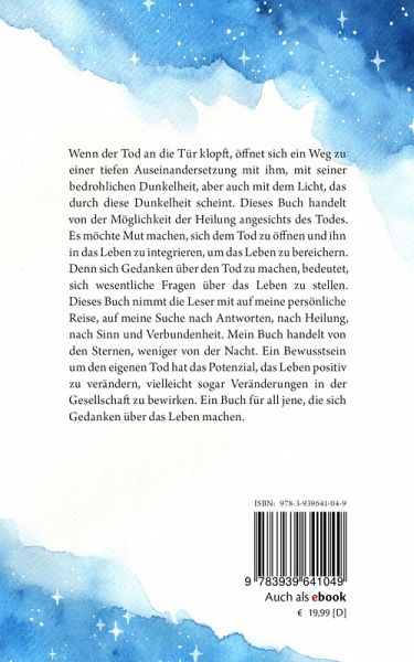 Wenn der Tod an die Tür klopft, öffnet sich ein Weg zu einer tiefen Auseinandersetzung mit ihm, mit seiner bedrohlichen Dunkelheit, aber auch mit dem Licht, das durch diese Dunkelheit scheint. Dieses Buch handelt von der Möglichkeit der Heilung angesichts des Todes. Es möchte Mut machen, sich dem Tod zu öffnen und ihn in das Leben zu integrieren, um das Leben zu bereichern. Denn sich Gedanken über den Tod zu machen, bedeutet, sich wesentliche Fragen über das Leben zu stellen. Dieses Buch nimmt die Leser mit auf meine persönliche Reise, auf meine Suche nach Antworten, nach Heilung, nach Sinn und Verbundenheit. Mein Buch handelt von den Sternen, weniger von der Nacht. Ein Bewusstsein um den eigenen Tod hat das Potenzial, das Leben positiv zu verändern, vielleicht sogar Veränderungen in der Gesellschaft zu bewirken. Ein Buch für all jene, die sich Gedanken über das Leben machen.