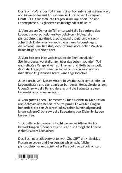 Das Buch «Wenn der Tod immer näher kommt» ist eine Sammlung von (unveränderten) Antworten der künstlichen Intelligenz ChatGPT auf menschliche Fragen, rund um Leben, Tod und Lebensphasen.