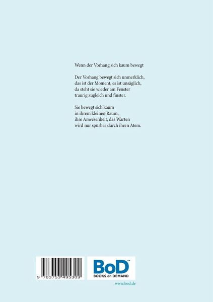 Wenn der Vorhang sich kaum bewegtDer Vorhang bewegt sich unmerklich,das ist der Moment, es ist unsäglich,da steht sie wieder am Fenstertraurig zugleich und finster.Sie bewegt sich kaumin ihrem kleinen Raum,ihre Anwesenheit, das Wartenwird nur spürbar durch ihren Atem.Vor Wochen verlor sie die Sprache,ihr Hund wurde geklaut auf offener Straße.Von hinten wurde sie angegriffen,die Tasche mit Samson weggerissen...