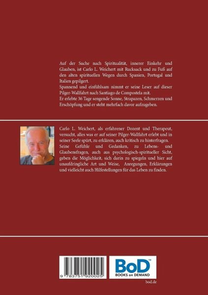 Auf der Suche nach Ruhe, Spiritualität, innerer Einkehr und Glauben, ist Carlo L. Weichert schon viele Male mit Rucksack und zu Fuß auf den alten spirituellen Wegen durch Spanien, Portugal und Italien gepilgert. In seinem Buch schildert er brillant seine Erlebnisse, Erkenntnisse und Erfahrungen, die er 800 km auf dem berühmten Jakobsweg von den Pyrenäen bis zum Apostelgrab machen durfte.Spannend und einfühlsam nimmt er seine Leser auf dieser Pilger-Wallfahrt nach Santiago de Compostela mit. Er erlebte 36 Tage sengende Sonne, Strapazen, Schmerzen und Erschöpfung und er steht mehrfach davor aufzugeben. Aber seine Seele gibt ihm immer wieder die Kraft weiter zu gehen. Auf diesem geheimnisvoll - spirituellen Weg öffnete sich seine Seele immer mehr, lässt ihn immer tiefer in sein Leben, seine Partnerschaften, seine problematische Kindheit und an Ende in seine Beziehung zu Gott hineinblicken, damit er sich besser kennen und verstehen lernt.Der Wert des Buches liegt auch darin, dass Carlo L. Weichert, als erfahrener Dozent und Therapeut versucht, alles was er auf dieser Pilger-Wallfahrt erlebt und in seiner Seele spürt, tiefgreifend zu erklären und kritisch zu hinterfragen.Seine Gedanken, Gefühle und psychologisch - spirituellen Hintergrunderklärungen auch zu Glaubensfragen, geben dem Buch Tiefe und dem Leser die Möglichkeit, sich darin zu spiegeln und sich so, auf unaufdringliche Art und Weise, Anregungen, Erklärungen, vielleicht auch Hilfestellung für das eigene Leben holen zu können.
