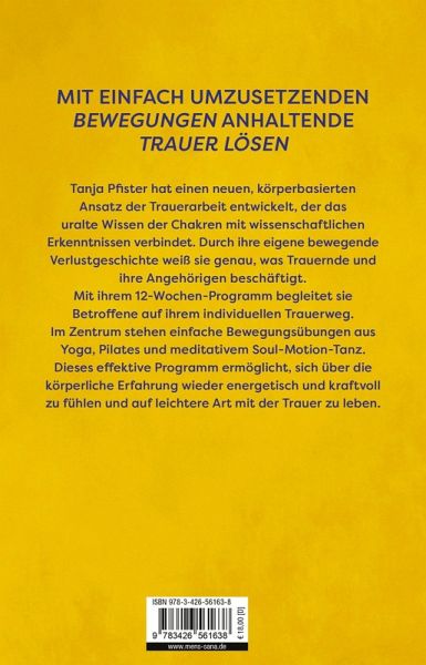 Tanja Pfister hat selbst einen schweren Verlust erlitten. Als ihr Mann nach langer Krankheit verstarb, blieb sie mit zwei kleinen Kindern zurück und musste wieder einen Weg ins Leben finden. Nachdem alle Versuche mittels Psychotherapie, Trauerbegleitung und Trauergruppe erfolglos geblieben waren, stieß sie auf Yoga, Pilates und Soul Motion und fand endlich einen direkten Zugang zu ihrer Trauer. Daraufhin hat sie über Jahre dieses immer erfolgreicher werdende 12-Wochen-Übungsprogramm speziell für Trauernde entwickelt, das durch das Buch Schritt für Schritt nachvollzogen werden kann.