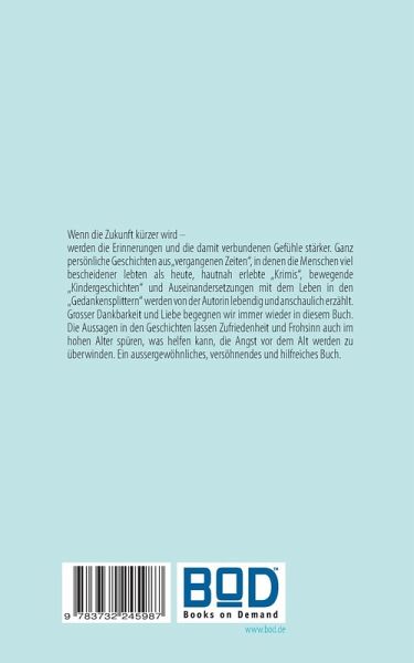 Wenn die Zukunft kürzer wird - werden die Erinnerungen und die damit verbundenen Gefühle stärker. Ganz persönliche Geschichten aus "vergangenen Zeiten", in denen die Menschen viel bescheidener lebten als heute, hautnah erlebte "Krimis", bewegende "Kindergeschichten" und Auseinandersetzungen mit dem Leben in den "Gedankensplittern" werden von der Autorin lebendig und anschaulich erzählt.Grosser Dankbarkeit und Liebe begegnen wir immer wieder in diesem Buch. Die Aussagen in den Geschichten lassen Zufriedenheit und Frohsinn auch im hohen Alter spüren, was helfen kann, die Angst vor dem Altwerden zu überwinden. Ein aussergewöhnliches, versöhnendes und hilfreiches Buch.